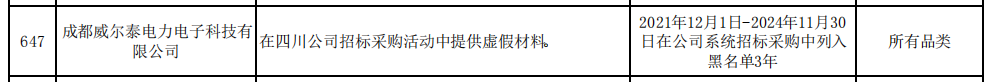 其中,成都威尔泰电力电子科技有限公司在四川公司招标采购活动中提供虚假材料被通报。处理措施:2021年12月1日-2024年11月30日在公司系统招标采购中列入黑名单3年。处理范围:所有品类。
