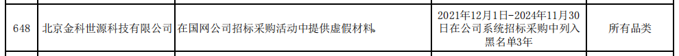 其中,北京金科世源科技有限公司在国网公司招标采购活动中提供虚假材料被通报。处理措施:2021年12月1日-2024年11月30日在公司系统招标采购中列入黑名单3年。处理范围:所有品类。