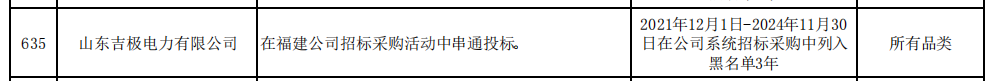 其中,山东吉极电力有限公司在福建公司招标采购活动中串通投标被通报。处理措施:2021年12月1日-2024年11月30日在公司系统招标采购中列入黑名单3年。处理范围:所有品类。