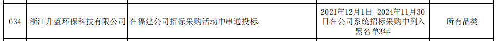 其中,浙江升蓝环保科技有限公司在福建公司招标采购活动中串通投标被通报。处理措施:2021年12月1日-2024年11月30日在公司系统招标采购中列入黑名单3年。处理范围:所有品类。