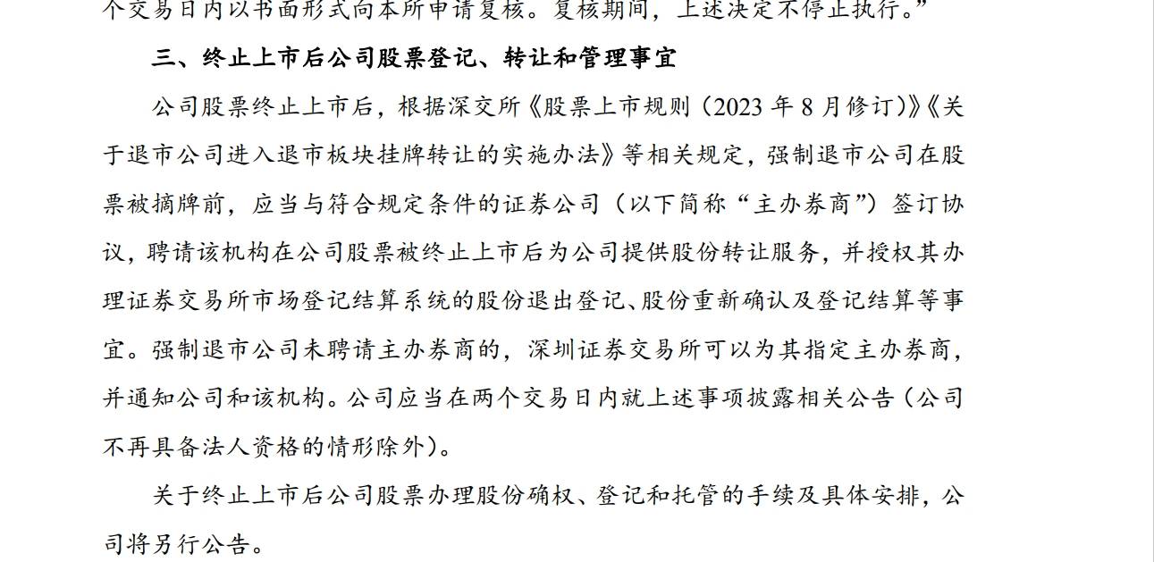 按照深交所相关规定,公司股票因触及交易类强制退市情形被作出终止上市决定,不进入退市整理期,公司股票将于深交所作出终止上市决定后十五个交易日内摘牌。