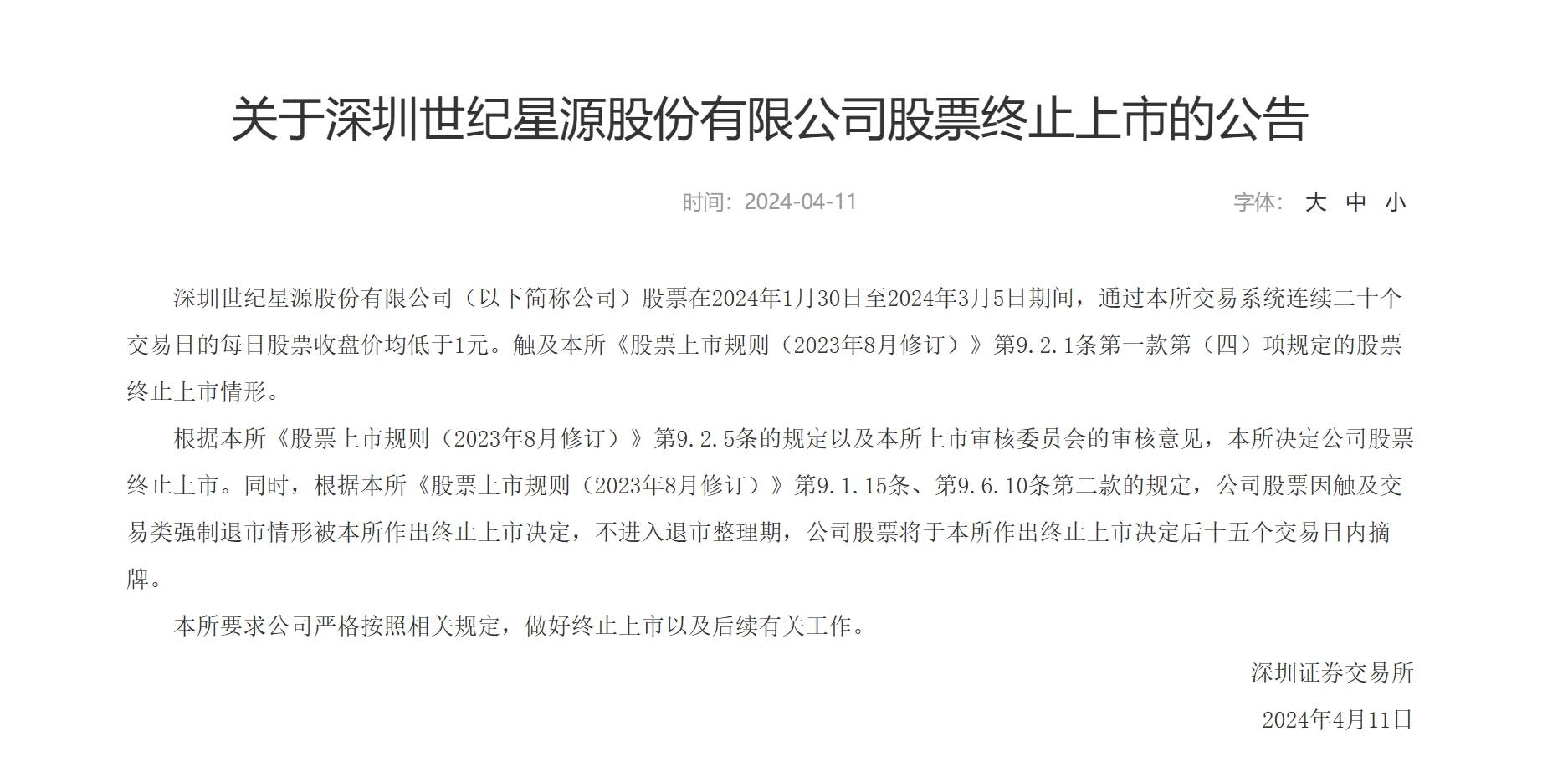 4月11日,深交所发布关于深圳世纪星源股份有限公司股票终止上市的公告。这意味着,这家在深交所上市34年老牌企业,即将告别A股市场。