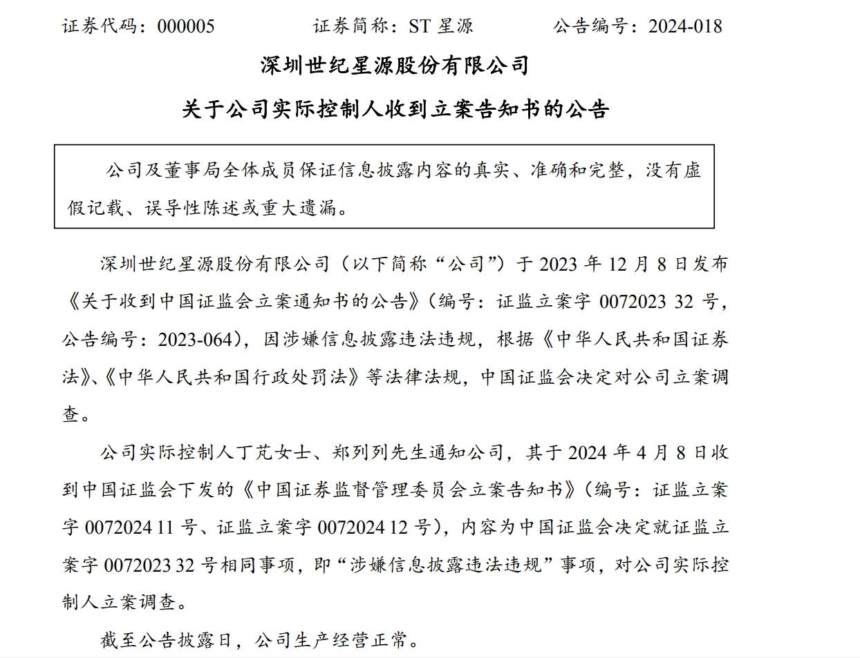 4月10日晚间,ST星源披露公告,公司实际控制人丁芃、郑列列4月8日通知公司,其于4月8日收到证监会下发的立案告知书,因涉嫌信息披露违法违规,证监会对二人立案调查。