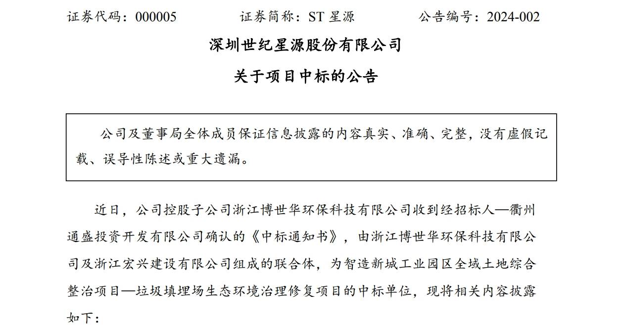 股价跌破1元,ST星源并不是没有尝试“自救”。2月1日,公司称收到《中标通知书》,控股子公司联合中标3.35亿元项目。2月21日,公司又宣布,上述中标项目正式签订合同。