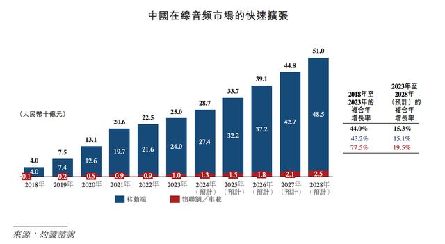 行业层面,据灼识咨询的资料,中国在线音频市场的收入已从2018年的40亿元增长至2023年的250亿元,复合年增长率为44.0%,并预计到2028年进一步增长至510亿元,2023年至2028年的复合年增长率为15.3%。