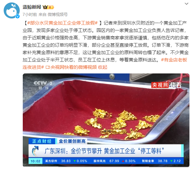 据央视新闻报道,深圳水贝附近的多家黄金加工企业目前处于停工状态。园区内的一家黄金加工企业负责人告诉记者,由于近期黄金价格强势走高,下游黄金销售商家拿货逐渐谨慎,包括他在内的多家黄金加工企业的订单均明显下滑,部分企业甚至直接停工放假。