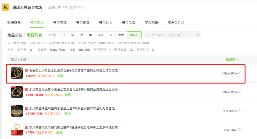 消费热情在线上同样可以被感知到。蓝鲸记者查询线上水贝黄金店铺发现,近一周同样多家店铺销量暴涨,不少水贝店铺的周销售额已达500万元,销量最高的日销售额有100万-250万元。其中一家水贝黄金店铺,近2万元的黄金手镯一周内卖出250万元。