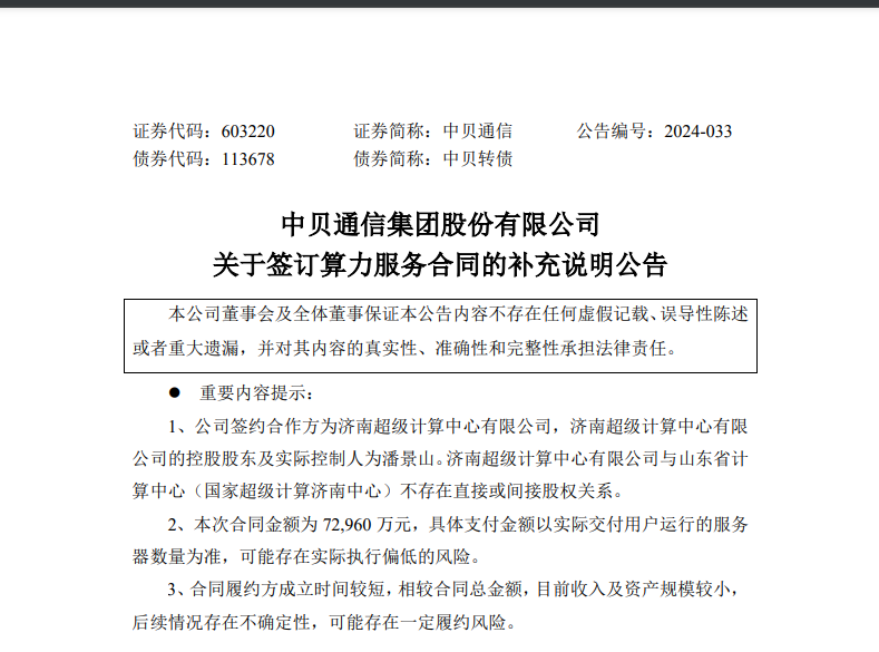 和监管函几乎同步,中贝通信4月12日发布了关于签订算力服务合同的补充说明公告。中贝通信称,公司签约合作方为济南超级计算中心有限公司,济南超级计算中心有限公司的控股股东及实际控制人为潘景山。济南超级计算中心有限公司与山东省计算中心(国家超级计算济南中心)不存在直接或间接股权关系。