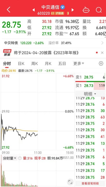 4月12日,中贝通信(603220.SH)低开近7%,截至午盘,中贝通信报28.75元/股,跌幅3.91%,市值96.38亿元。