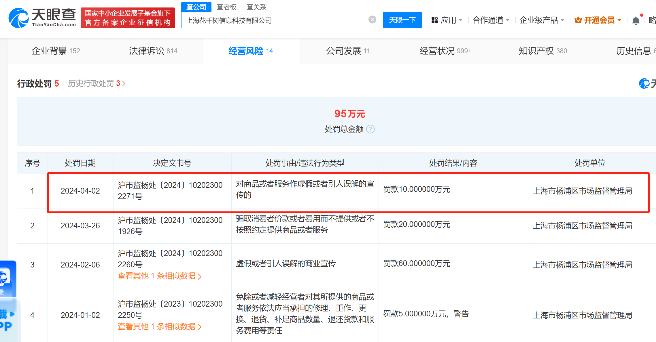 天眼查App显示,近日,世纪佳缘旗下上海花千树信息科技有限公司因对商品或者服务作虚假或者引人误解的宣传,违反消费者权益保护法,被上海市杨浦区市场监督管理局罚款10万元。