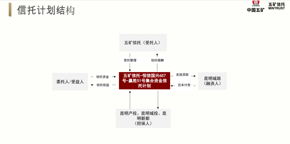 中国证券报记者4月11日了解到,五矿信托受托管理的“恒信国兴636号-昆明基投集合资金信托计划”“恒信国兴657号-赢胜51号集合资金信托计划”(下称“恒信国兴657号”)及“五矿信托-恒信国兴659号-新都1号集合资金信托计划”已逾期。五矿信托内部人士向记者透露,上述三个产品都是政信类项目,融资方及担保方为云南省昆明市各类城投公司,目前正在全力化解风险中。