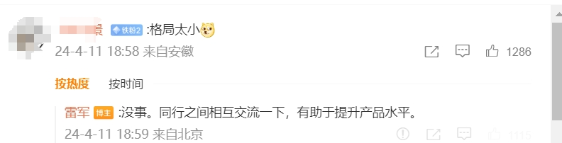 在雷军这条微博下,有网友评论称,“格局太小”,雷军对此回应道:“没事。同行之间相互交流一下,有助于提升产品水平。”