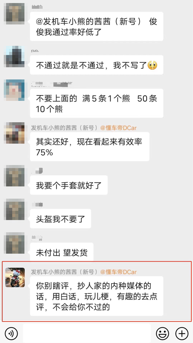 群聊显示,群内多名参与者反映,他们也曾发布点评,最后却因审核无效被取消奖品。群内懂车帝的工作人员则回复称“你别瞎评,抄人家的内种媒体的话,用白话,玩儿梗,有趣的去点评,不会给你不过的”。
