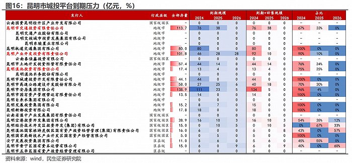 截至目前,民生证券指出,昆明市城投平台有息债务有4500多亿,并且当前昆明市城投平台债务短期化现象仍较为明显,2024年到期较为集中。包括昆明轨交、昆明城投、昆明国资、昆明发投、昆明自来水、昆明高新区国资的存量债全部在2024年到期。