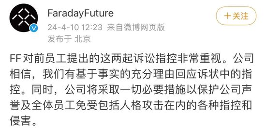 FF汽车官方回应表示,对前员工提出的两起诉讼指控非常重视。“公司相信,有基于事实的充分理由回应诉状中的指控。同时,公司将采取一切必要措施以保护公司声誉及全体员工免受包括人格攻击在内的各种指控和侵害。”