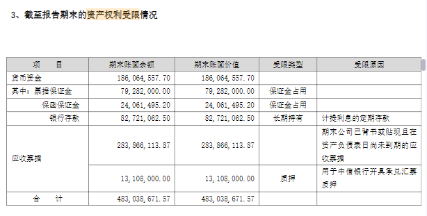 另外,年报显示,截至2023年末,华菱线缆有高达4.83亿元的资产权利受限。其中,受限的货币资金额为1.86亿元、因期末公司已背书或贴现且尚未到期的应收票据额为2.84亿元和用于中信银行开具承兑汇票质押的应收票据1310.80万元。