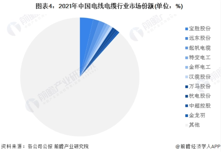 就国内电线电缆行业现状来看,2022年我国电线电缆行业的市场规模达1.17万亿元。不过,我国电线电缆行业竞争激烈,市场份额较分散,据前瞻产业研究院数据,2021年,除了宝胜股份、远东股份和起帆电缆之外,其他企业的市场份额均低于1%。