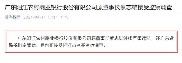 4月11日,据阳江市纪委监委消息:广东阳江农村商业银行股份有限公司原董事长蔡志雄涉嫌严重违法,经广东省监委指定管辖,目前正接受阳江市监委监察调查。