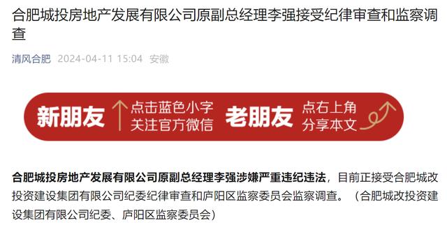 合肥城投房地产发展有限公司原副总经理李强涉嫌严重违纪违法,目前正接受合肥城改投资建设集团有限公司纪委纪律审查和庐阳区监察委员会监察调查。