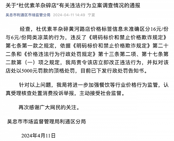 吴忠市市场监督管理局利通区分局4月11日通报,经查,杜优素羊杂碎黄河路店价格标签信息未准确区分16元/份与6元/份同类凉菜的行为,违反了《明码标价和禁止价格欺诈规定》第七条第一款之规定,依据《明码标价和禁止价格欺诈规定》第二十二条和《价格违法行为行政处罚规定》第十三条第二项、第十七条第二款第(一)项之规定,该局责令该店立即改正违法行为,并拟对该店处以5000元罚款的顶格处罚,目前已下发行政处罚告知书。