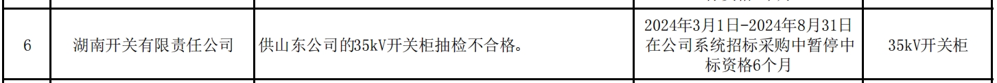 其中,湖南开关有限责任公司因供山东公司的35kV开关柜抽检不合格被通报。处理措施为2024年3月1日至2024年8月31日在国家电网系统招标采购中暂停中标资格6个月。处理范围为35kV开关柜。