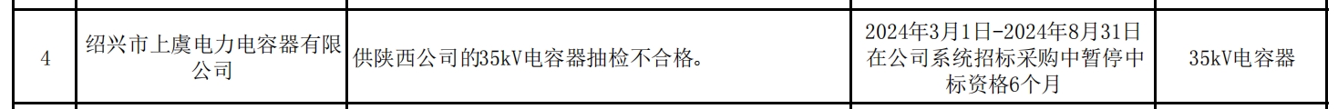 其中,绍兴市上虞电力电容器有限公司因供陕西公司35kV电容器抽检不合格被通报。处理措施:2024年3月1日-2024年8月31日在国家电网系统招标采购中暂停中标资格6个月。处理范围:35kV电容器。