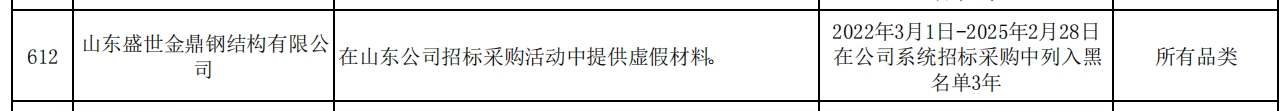 其中,山东盛世金鼎钢结构有限公司因在山东公司招标采购活动中提供虚假材料被通报。处理措施:2022年3月1日-2025年2月28日在公司系统招标采购中列入黑名单3年。处理范围:所有品类。