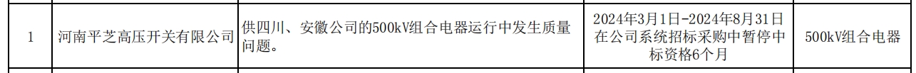 其中,河南平芝高压开关有限公司因供四川、安徽公司的500kV组合电器运行中发生质量问题被通报。处理措施:2024年3月1日-2024年8月31日在国家电网系统招标采购中暂停中标资格6个月。处理范围:500kV组合电器。