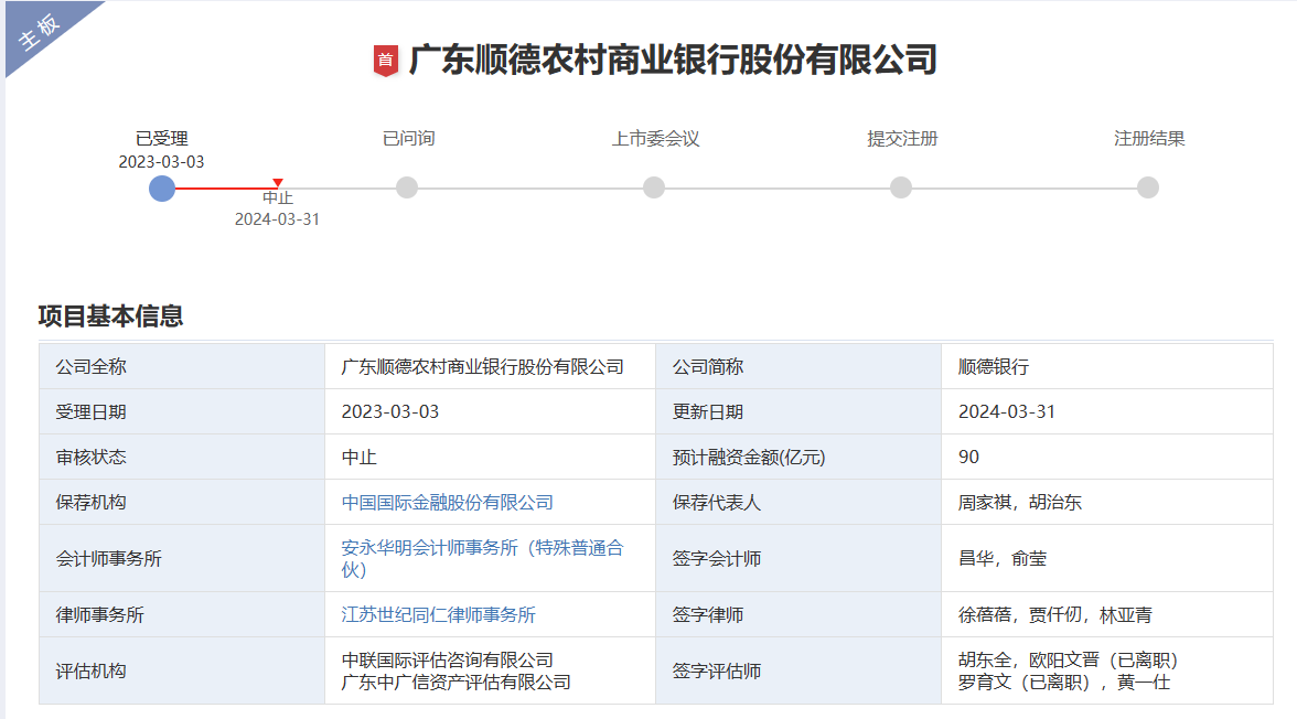 近日,深交所网站显示,广东顺德农村商业银行IPO申请目前已被中止。深交所网站显示原因为:广东顺德农村商业银行股份有限公司IPO申请文件中记录的财务资料已过有效期,需要补充提交。