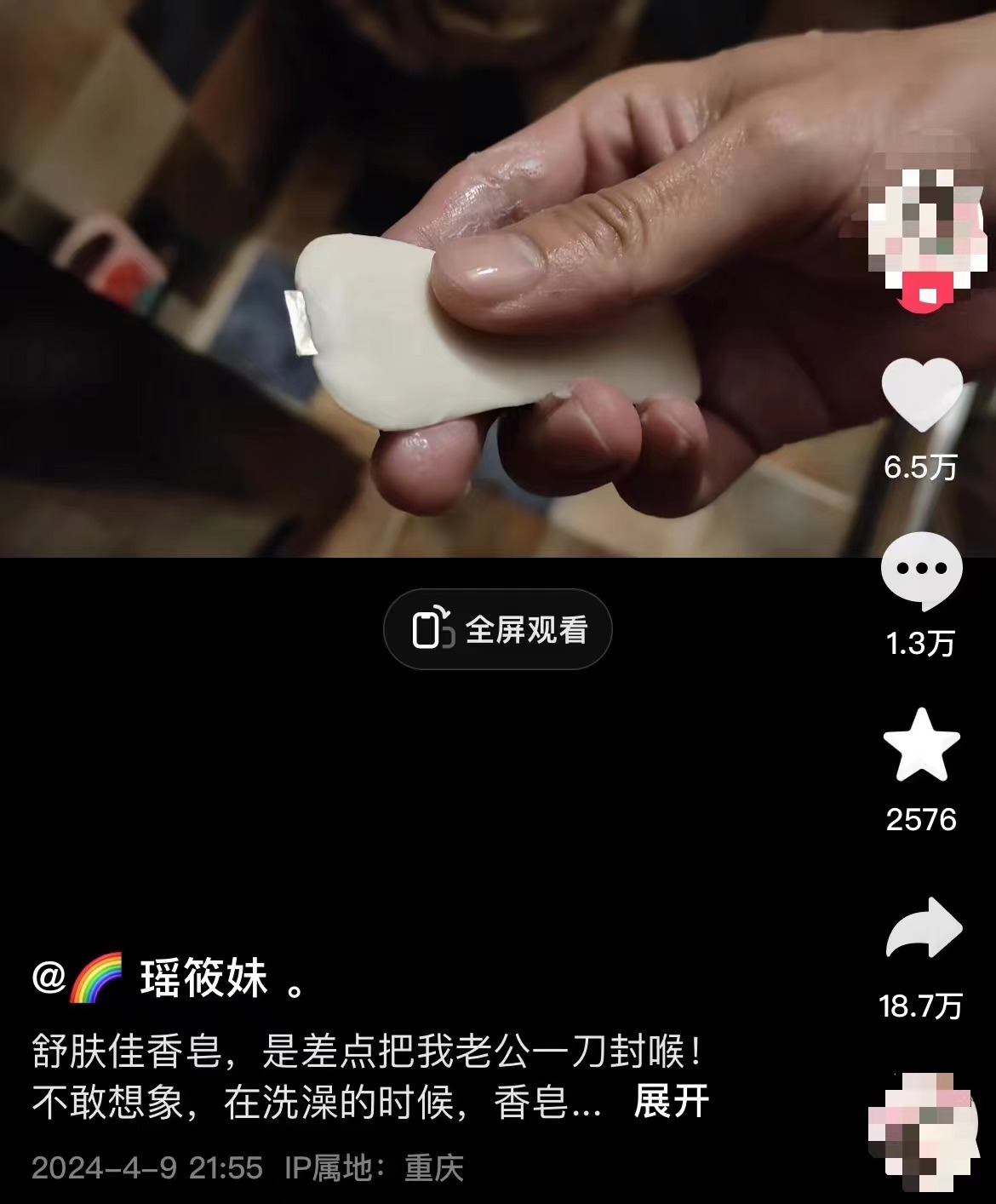 4月9日,重庆一女子在社交媒体发视频称老公用舒肤佳香皂时,差点被“一刀封喉”,发现香皂里藏有类似刀片的铁器。