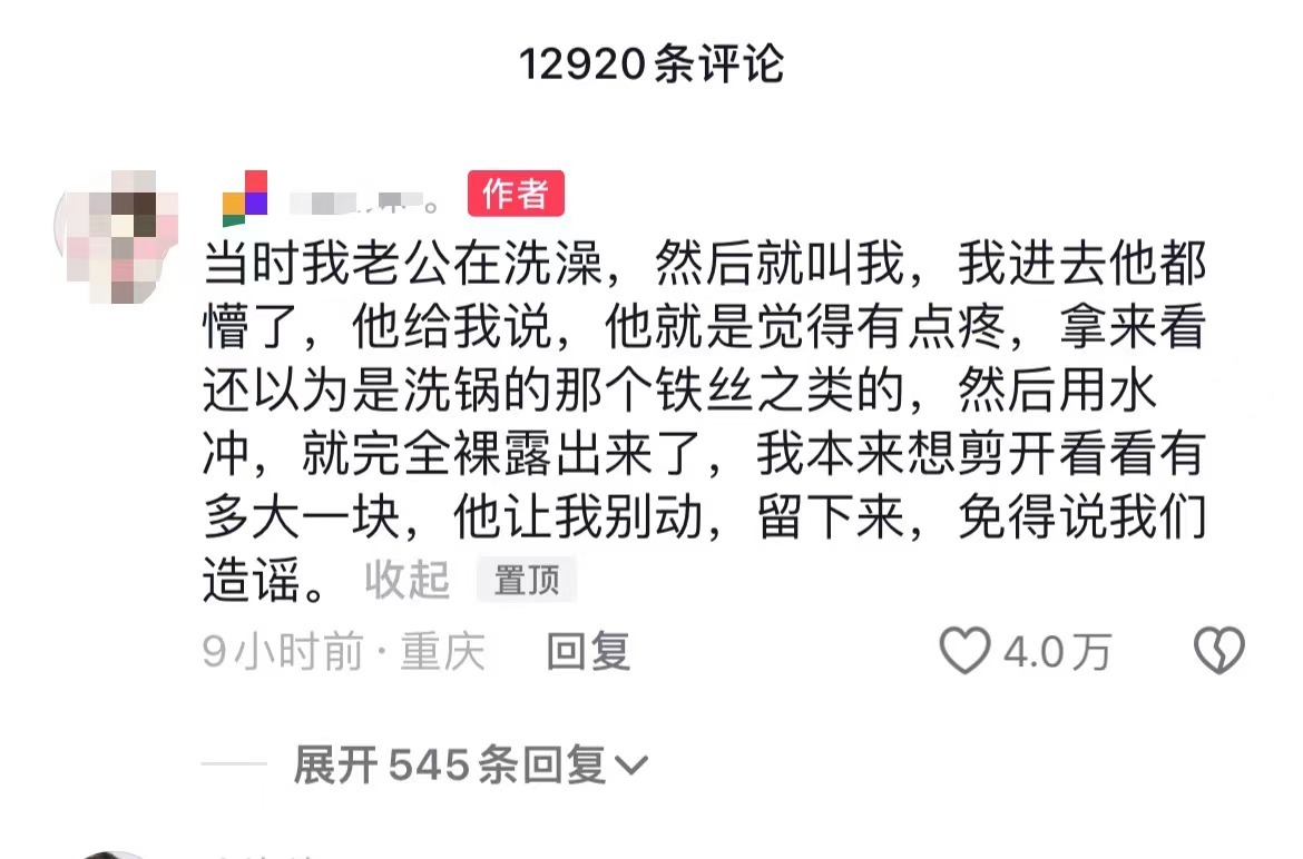 “当时我老公在洗澡,然后就叫我,我进去他都懵了,他给我说,他就是觉得有点疼,拿来看还以为是洗锅的那个铁丝之类的,然后用水冲,就完全裸露出来了,我本来想剪开看看有多大一块,他让我别动,留下来,免得说我们造谣。”该女子在视频评论区写道。
