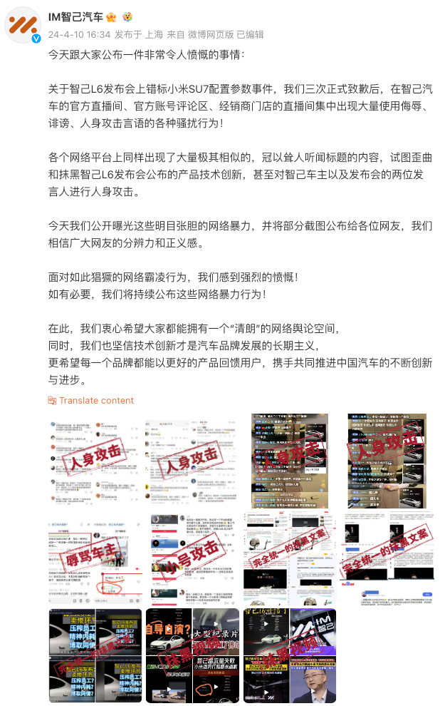 4月10日,智己汽车在其官方微博发文称,关于智己L6发布会上错标小米SU7配置参数事件,三次正式致歉后,在智己汽车的官方直播间、官方账号评论区、经销商门店的直播间集中出现大量使用侮辱、诽谤、人身攻击言语的各种骚扰行为。智己汽车现已公开曝光这些网络暴力,并将部分截图公布给各位网友,并表态如有必要,将持续公布这些网络暴力行为。