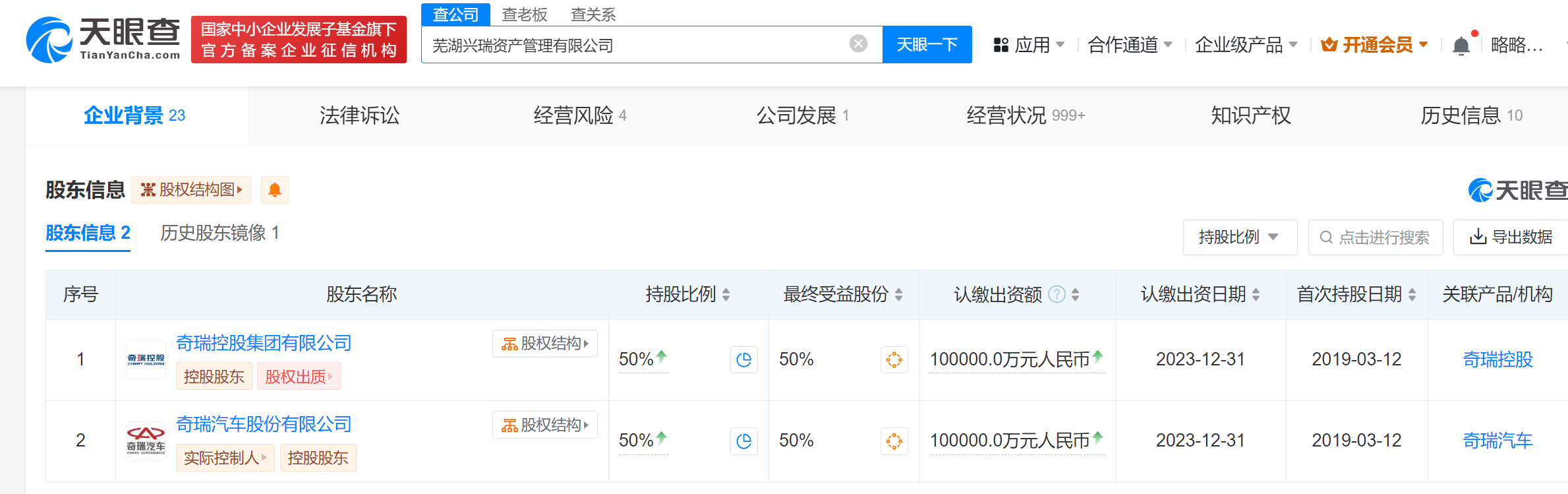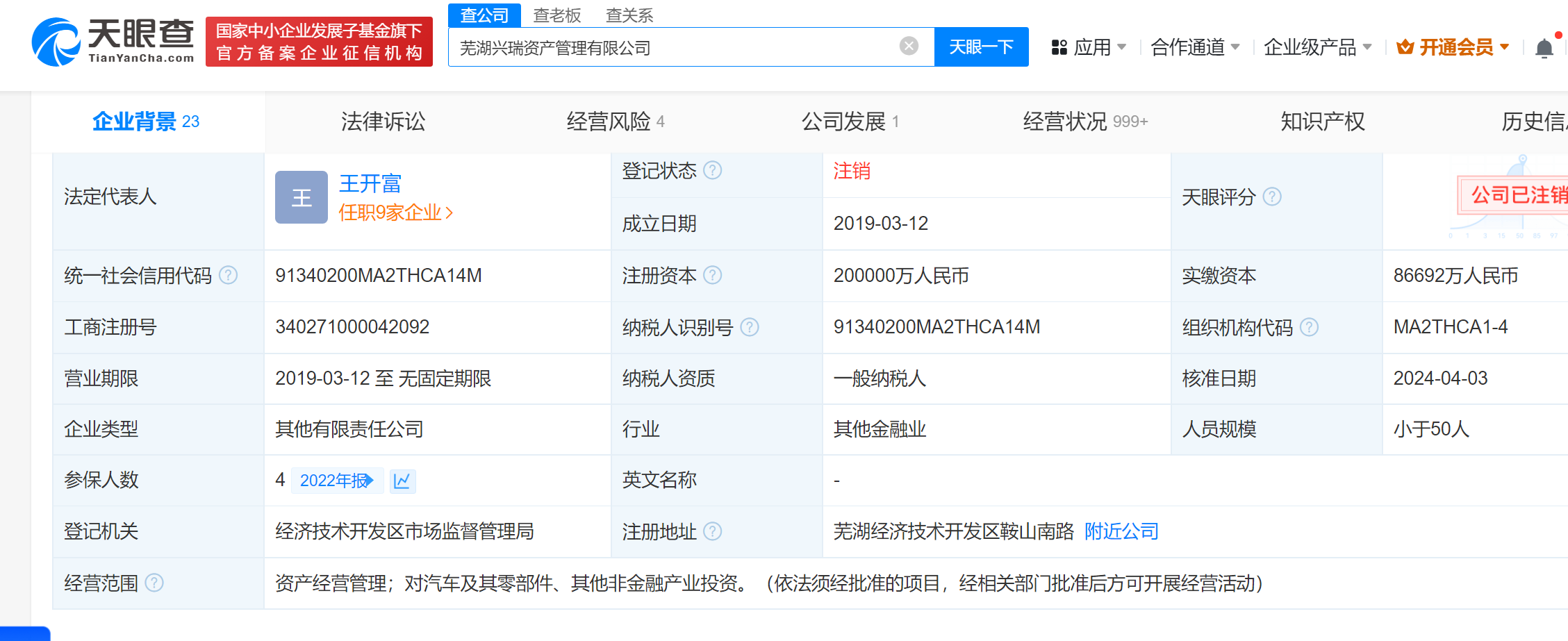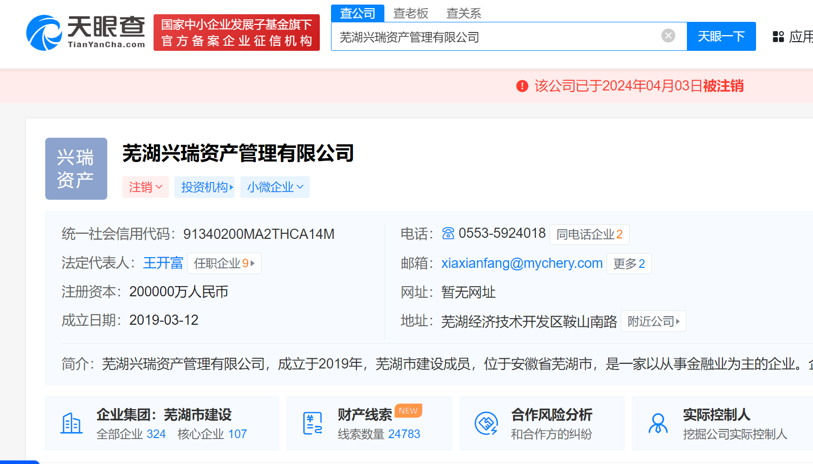 近日,芜湖兴瑞资产管理有限公司经营状态由存续变更为注销。该公司成立于2019年3月,法定代表人为王开富,注册资本20亿人民币,经营范围含资产经营管理,对汽车及其零部件、其他非金融产业投资。股东信息显示,该公司由奇瑞汽车股份有限公司和奇瑞控股集团有限公司共同持股。