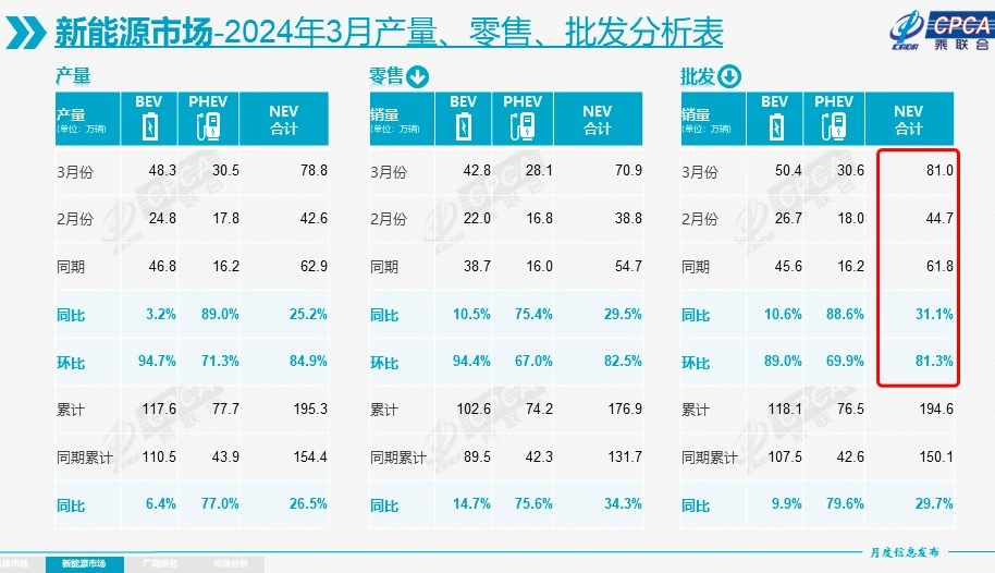 由于春节前厂商和渠道库存下降明显,3月汽车厂商生产恢复,形成了厂商产量持平于批发,但厂商国内批发高于零售10万辆的补库存走势。乘联会数据显示,从2023年9月到今年3月,厂商与渠道总体去库存21万辆,厂商渠道库存压力大幅缓解。