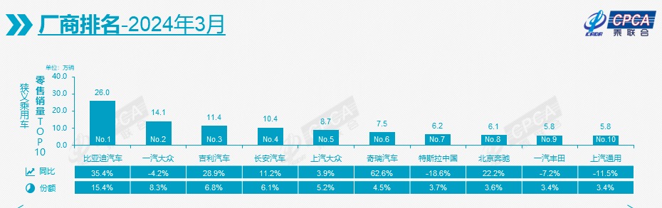 从国内狭义乘用车零售销量排名来看,3月排名前三的厂商中,有两家为自主车企。其中,比亚迪以26万辆的零售成绩位居第一,紧随其后的是一汽-大众(14.1万辆)与吉利汽车(11.4万辆)。