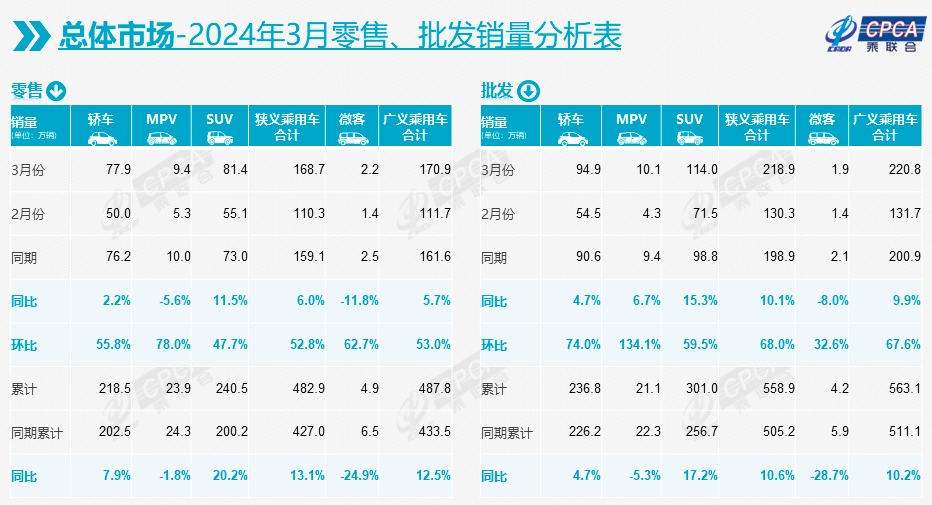 4月9日,乘联会发布的最新数据显示,3月,我国乘用车市场零售销量为168.7万辆,同比增长6%,环比增长52.8%。