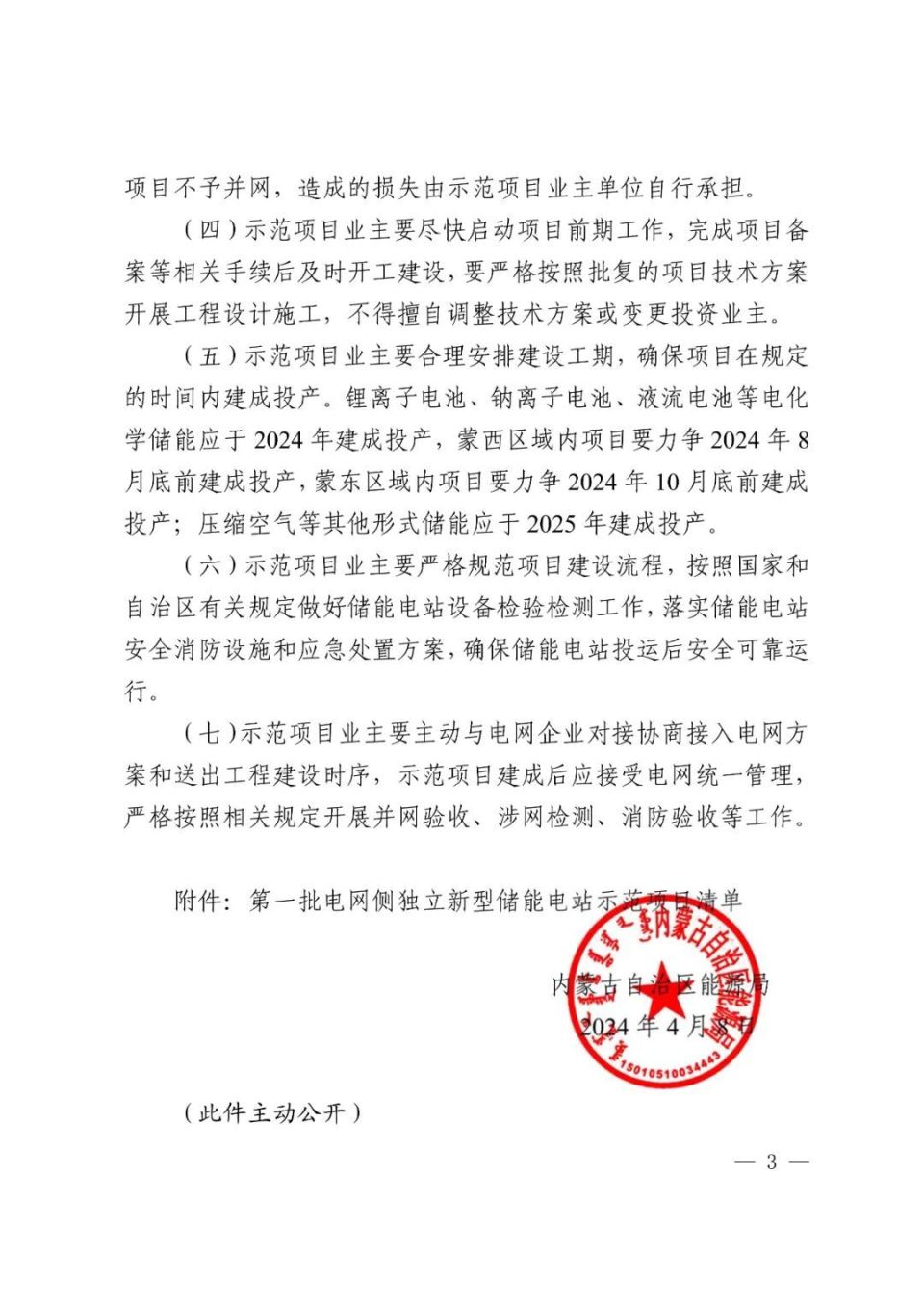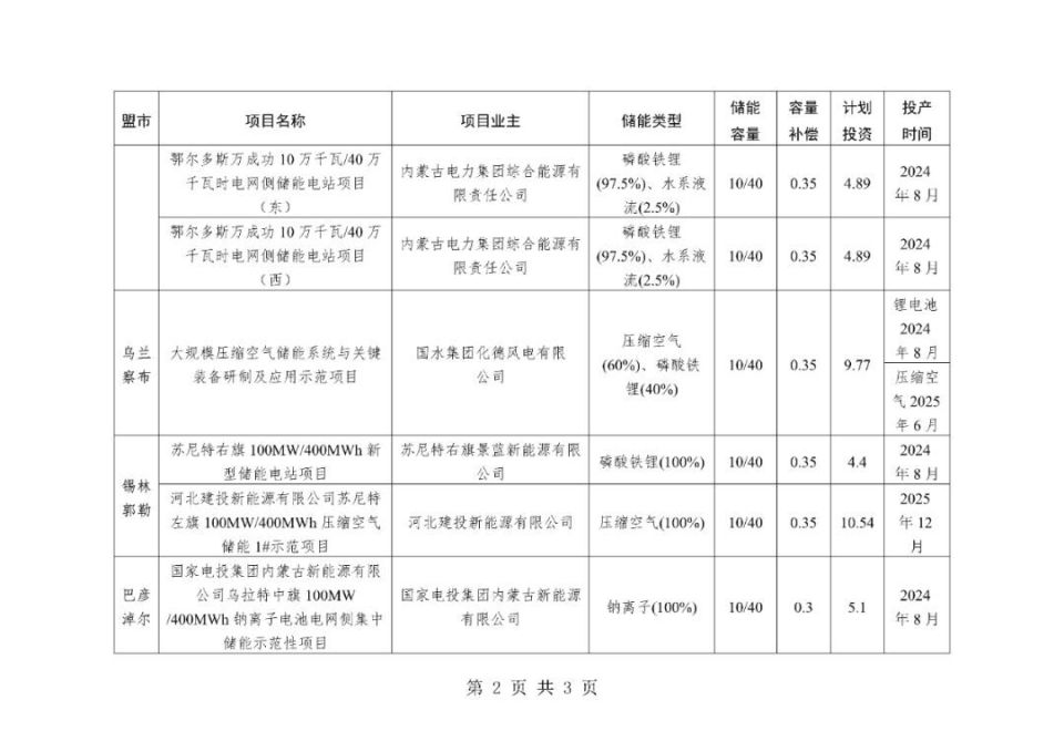 此外,《通知》还要求,锂离子电池、钠离子电池、液流电池等电化学储能应于2024年建成投产,蒙西区域内项目要力争2024年8月底前建成投产, 蒙东区域内项目要力争 2024年10月底前建成投产;压缩空气等其他形式储能应于2025年建成投产。