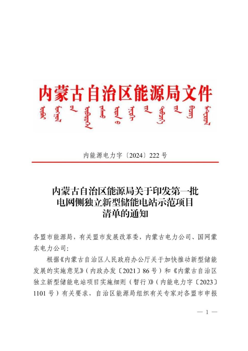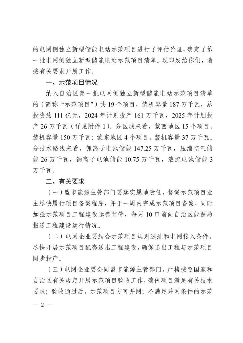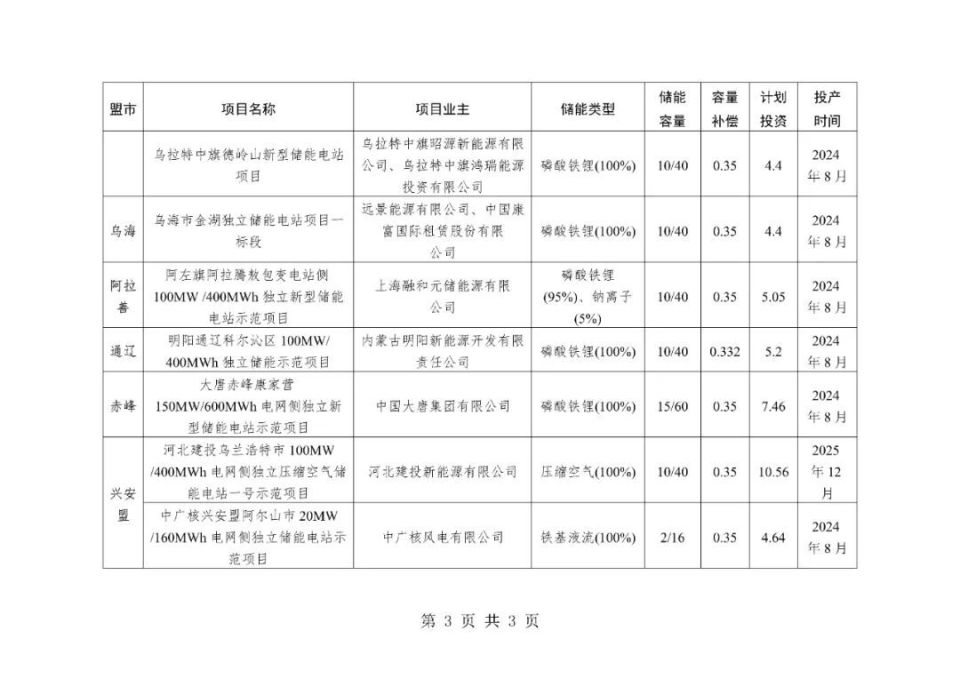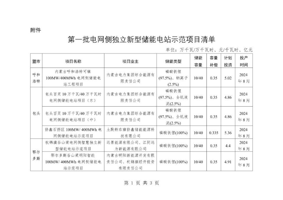 4月8日,内蒙古能源局发布《关于第一批电网侧独立新型储能示范项目清单的通知》,明确纳入第一批电网侧独立新型储能电站示范项目清单的共19个项目,装机容量187万千瓦/756万千瓦时,总投资约111亿元,2024年计划投产 161 万千瓦,2025年计划投26万千瓦(文末附具体项目清单)。
