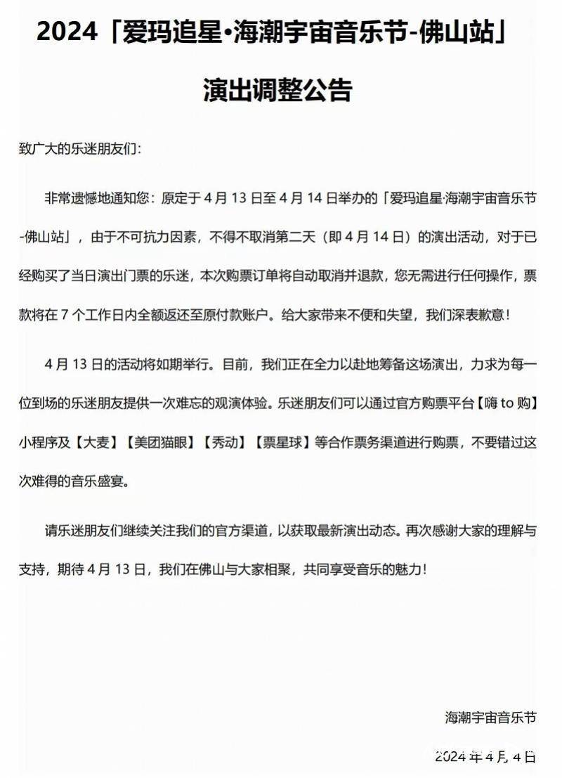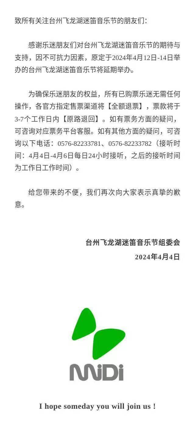 近期台州飞龙湖迷笛音乐节、温州星巢秘境音乐节、无锡九龙湾音乐节都因“不可抗力”宣布延期,而在大湾区,原定于3月30-31日在广州举办的星巢秘境音乐节因不可抗力“延期待定”,原定4月13-14日在从化举办的广州文化音乐节也因不可抗力延期举办,佛山海潮宇宙音乐节则因为不可抗力因素取消了4月14日的演出……