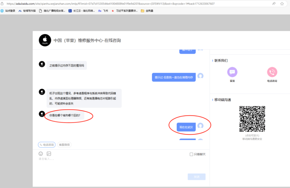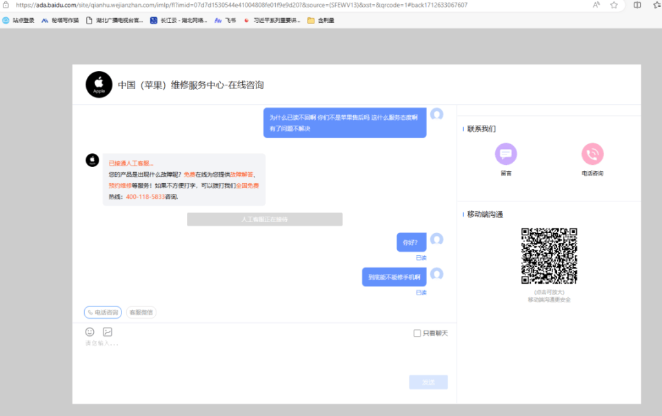 当记者表明维修地在武汉后,原本还与记者正常聊天的客服,已读不回。记者再次追问该店铺“是否为苹果官方售后”,聊天框也显示为已读不回。