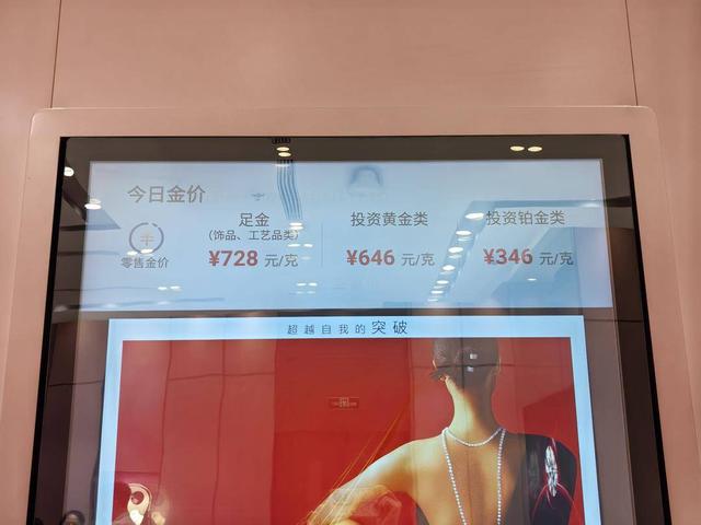 午后,扬子晚报/紫牛新闻记者浏览到“国际金价刷新历史新高,周大福等金店足金饰品价格已高达728元/克”的新闻,决定再度探访。下午4点多,记者看到周大福门店的“今日金价”果然有了变化:足金售价已涨至728元/克。这意味着,短短几个小时之间挂牌价涨幅就达2.2%左右。