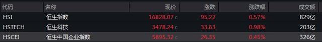 截至收盘,恒生指数涨0.57%报16828.07点,恒生科技指数涨0.98%报3478.24点,恒生国企指数涨0.45%报5895.32点。大市成交829.34亿港元。