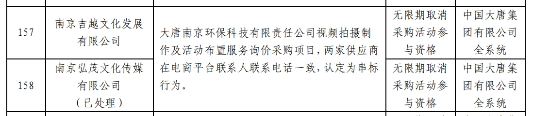 公告显示,大唐南京环保科技有限责任公司视频拍摄制作及活动布置服务询价采购项目,南京吉越文化发展有限公司与南京弘茂文化传媒有限公司 (已处理)在电商平台联系人联系电话一致,认定为串标行为。