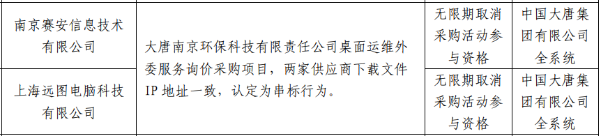 公告显示,大唐南京环保科技有限责任公司桌面运维外委服务询价采购项目,南京赛安信息技术有限公司与上海远图电脑科技有限公司两家供应商下载文件 IP 地址一致,认定为串标行为。