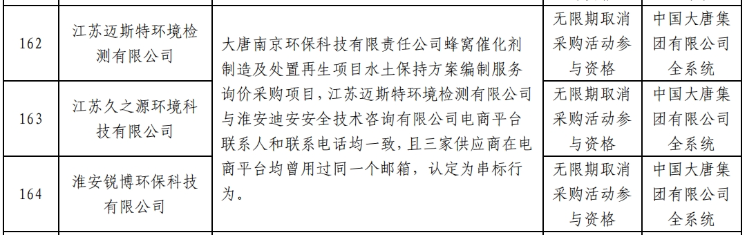 公告显示,在大唐南京环保科技有限责任公司蜂窝催化剂制造及处置再生项目水土保持方案编制服务询价采购项目中,江苏迈斯特环境检测有限公司与淮安迪安安全技术咨询有限公司电商平台联系人和联系电话均一致,且三家供应商在电商平台均曾用过同一个邮箱,认定为串标行为。