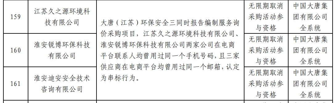 公告显示,在大唐(江苏)环保安全三同时报告编制服务询价采购项目中,江苏久之源环境科技有限公司、 淮安锐博环保科技有限公司两家公司在电商 平台联系人均曾用过同一个手机号码,且三家 供应商在电商平台均曾用过同一个邮箱,认定为串标行为。