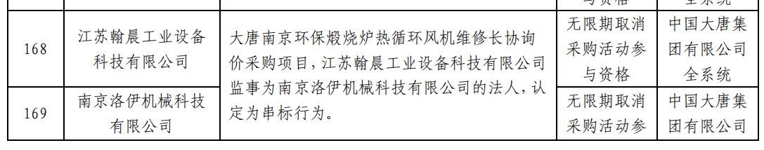 公告显示,大唐南京环保煅烧炉热循环风机维修长协询价采购项目,江苏翰晨工业设备科技有限公司监事为南京洛伊机械科技有限公司的法人,认定为串标行为 。
