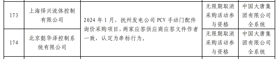 公告显示,2024年1月,在抚州发电公司PCV手动门配件询价采购项目中,上海怿兴流体控制有限公司与北京懿华泽控制系统有限公司因应答文件作者一致,被认定为串标行为。