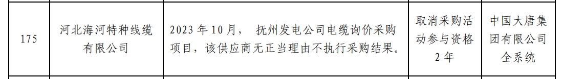 公告显示,2023 年 10 月, 抚州发电公司电缆询价采购项目,河北海河特种线缆有限公司无正当理由不执行采购结果。