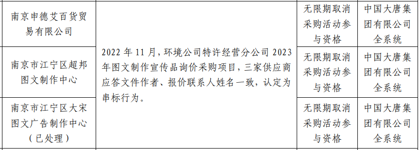 公告显示,2022 年 11 月,环境公司特许经营分公司 2023 年图文制作宣传品询价采购项目,南京申德艾百货贸易有限公司、南京市江宁区超邦图文制作中心以及南京市江宁区大宋图文广告制作中心(已处理)三家供应商应答文件作者、报价联系人姓名一致,认定为串标行为。